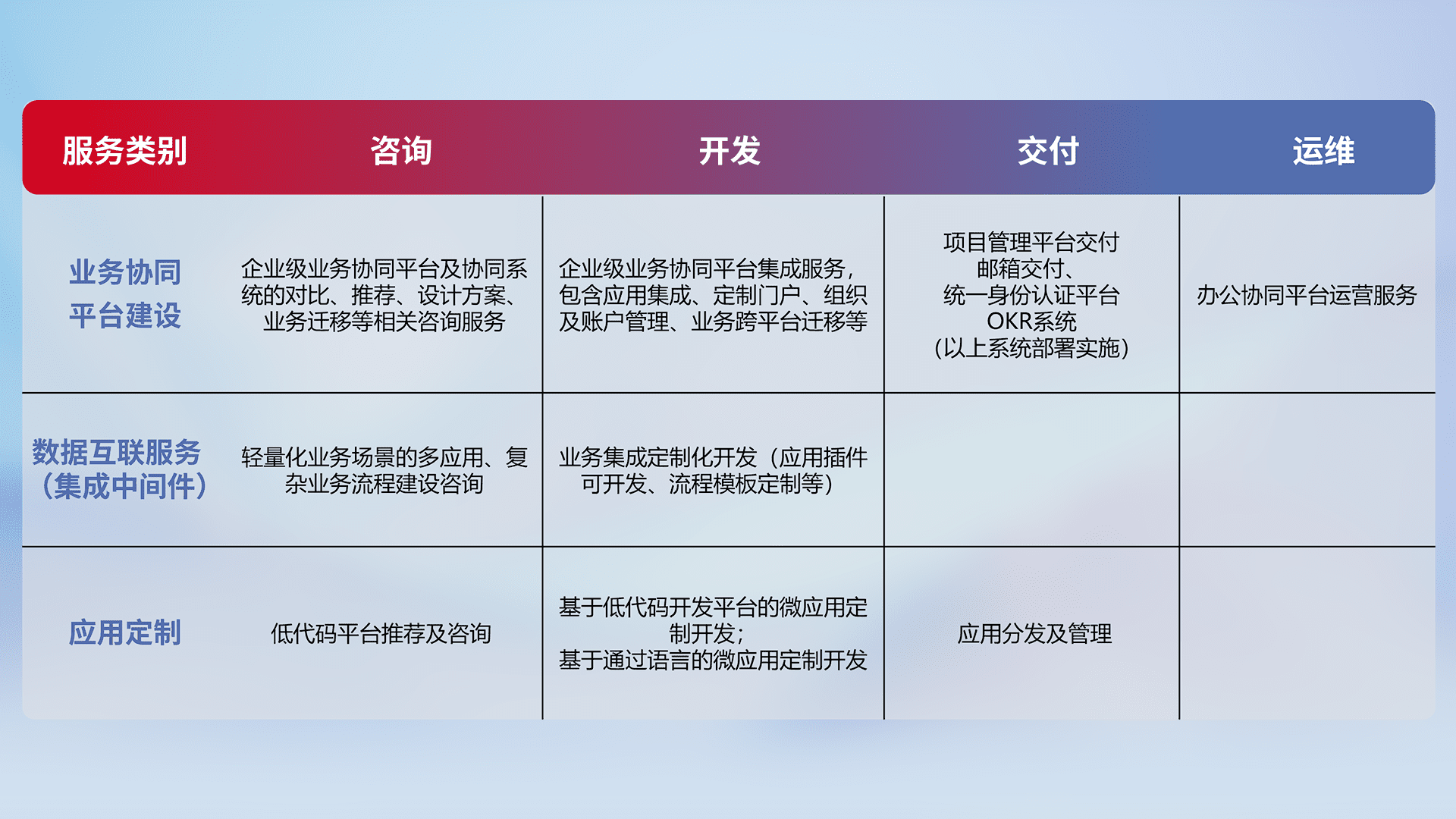 针对钉钉、、企微、、、、IDaas等平台级产品提供产品的规划、、方案、、交付、、、、定制化开发等服务,,实现如统一协同办公、、智能客户服务、、混合会议管理、、、智能数据查询、、、等业务场景,,,实现数字化转型。。。